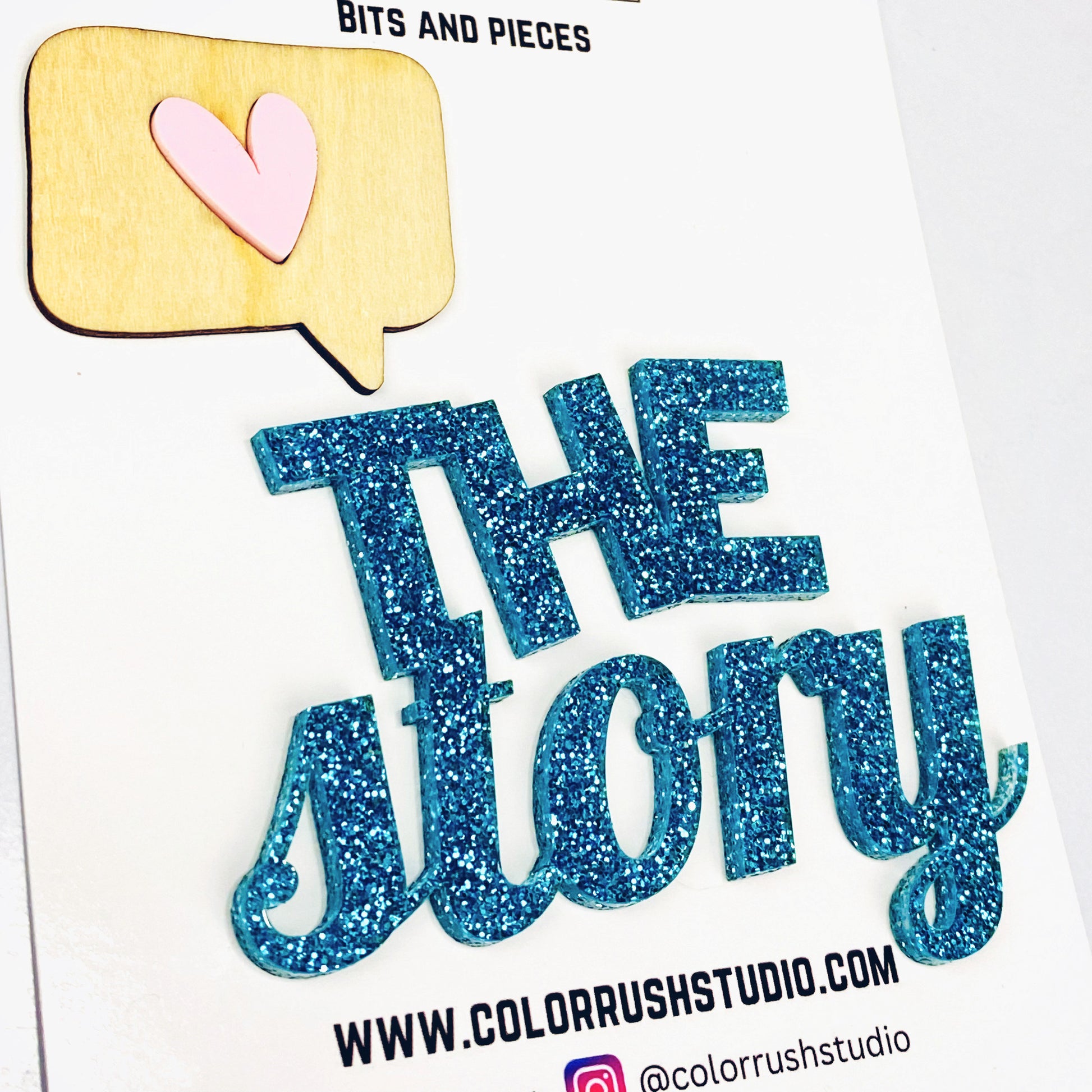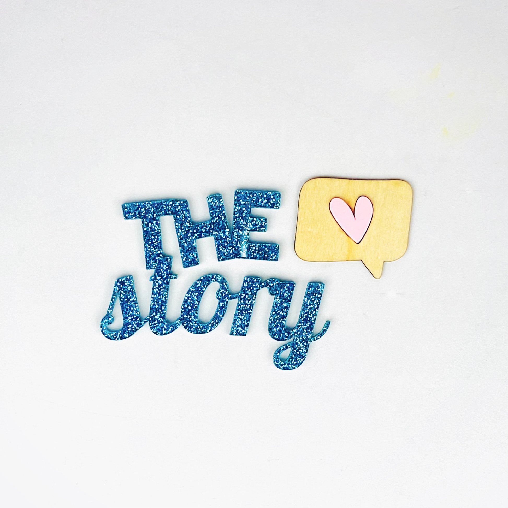 Acrylic piece in blue glitter stating the story with coordinating thought bubble and heart.