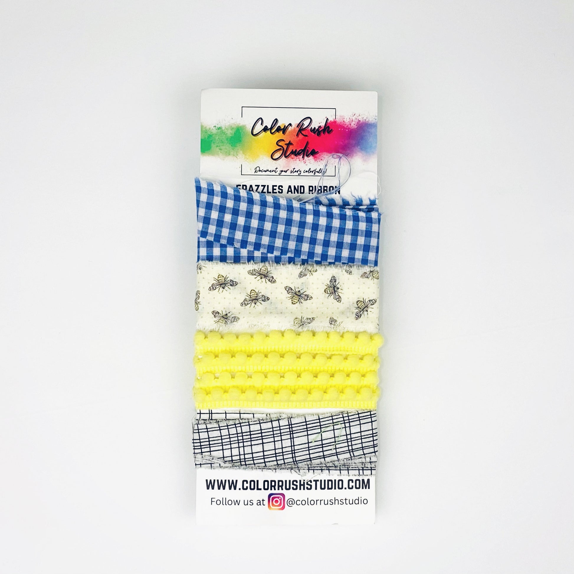 Bring texture and depth to your scrapbook pages or handmade cards with our frazzle ribbon. This gingham, bees, pom and B/W collection has 4 different patterns. Frazzles adds so much personality to your artwork.