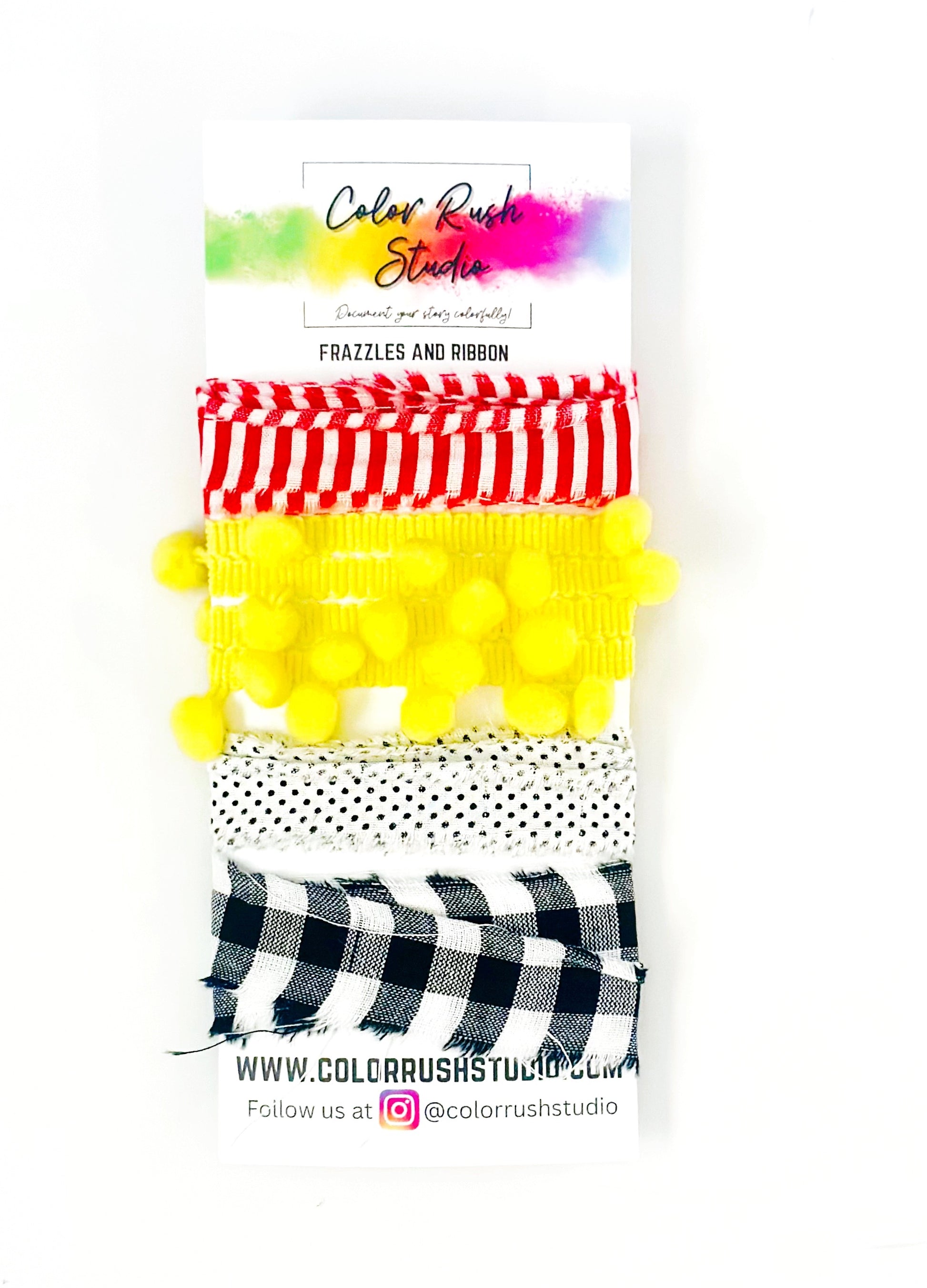 Bring texture and depth to your scrapbook pages or handmade cards with our frazzle ribbon. This black and white collection has 4 different patterns 36" each that adds so much personality to your artwork.