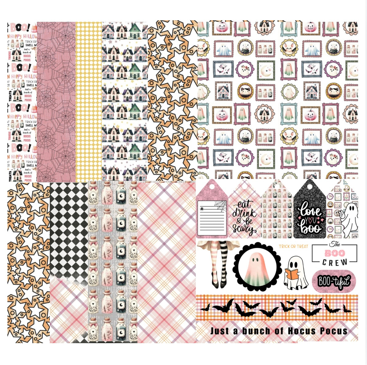 This paper pack includes 12 - double sided 12x12 pattern papers from the Hey, Boo exclusive CRS Oct line.