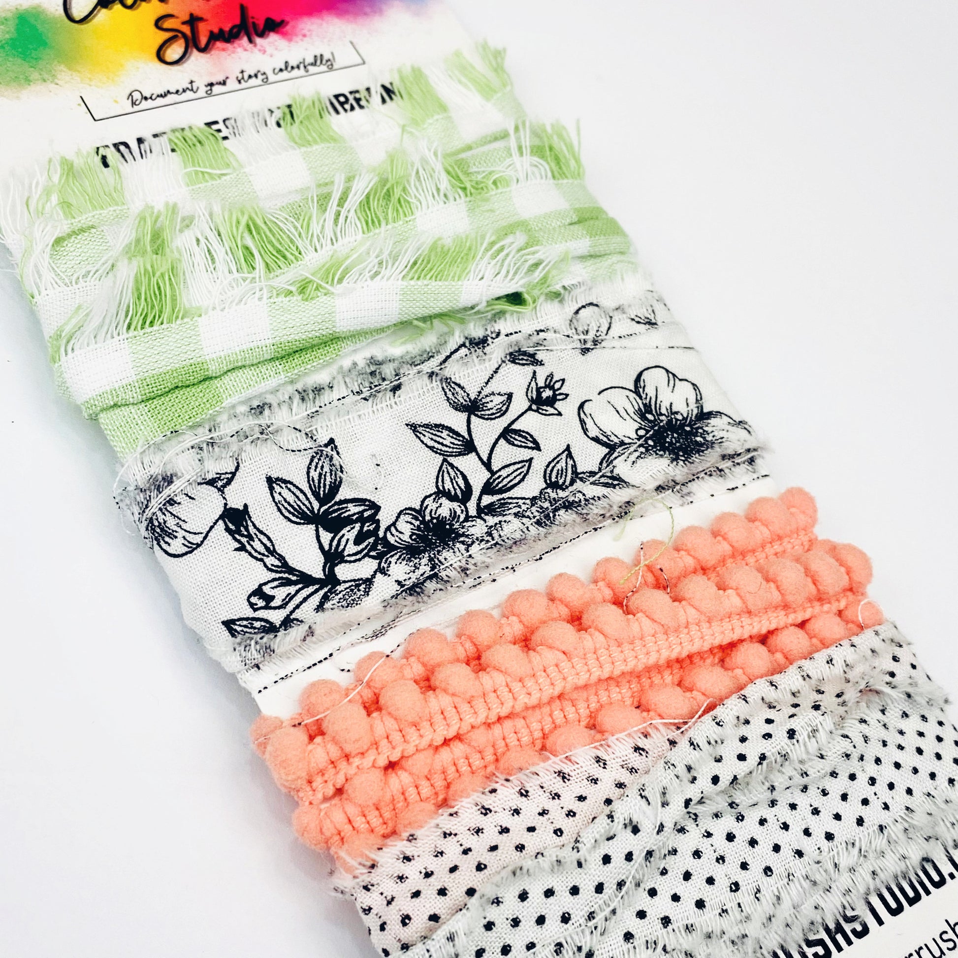 This frazzles and ribbons features 3 fabric frazzled ribbon roughly 36" and pom pom ribbon of 24" - 36"