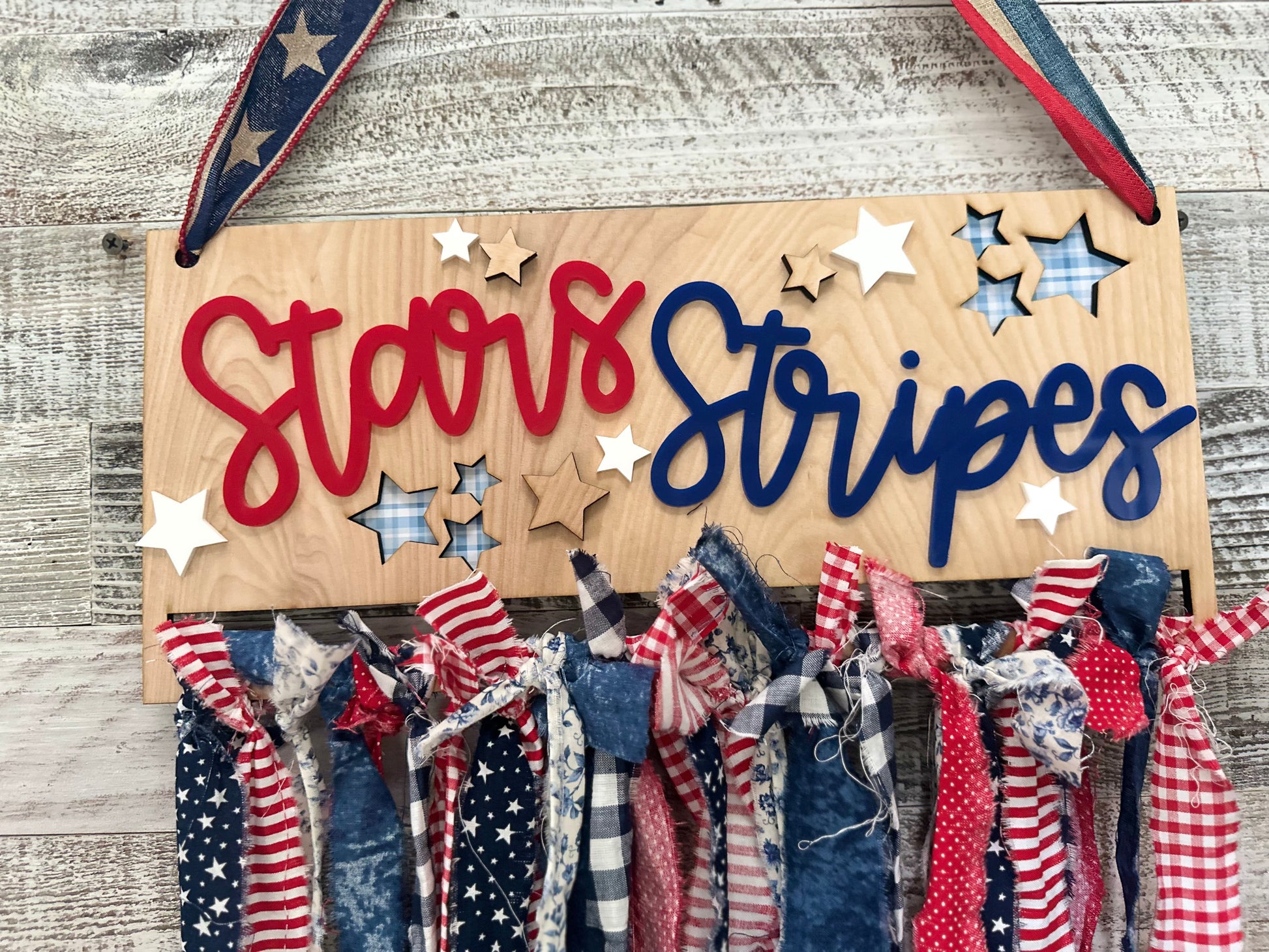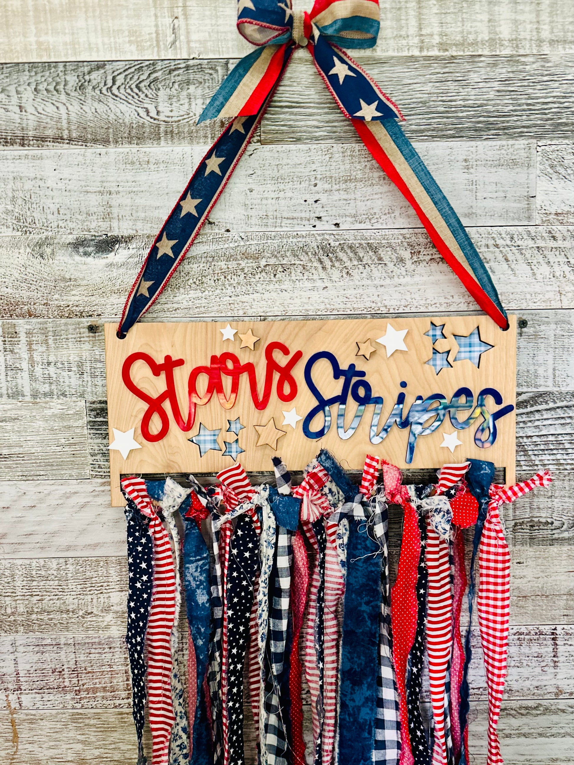 - A beautiful laser-cut wood base featuring star cutouts and some pattern papers to match. Wood sign is roughly 14”x 6 -3/4”